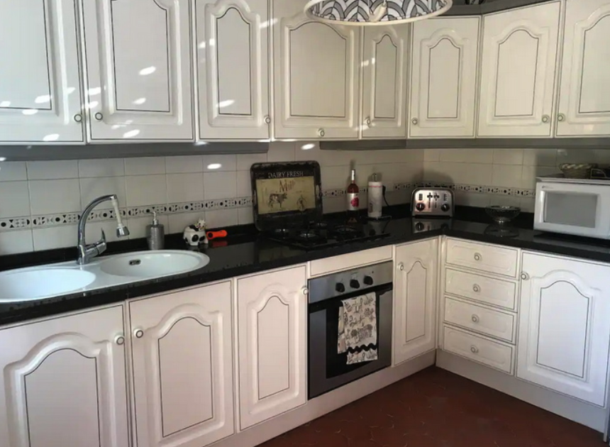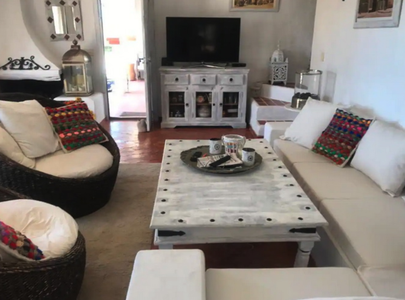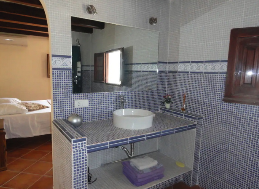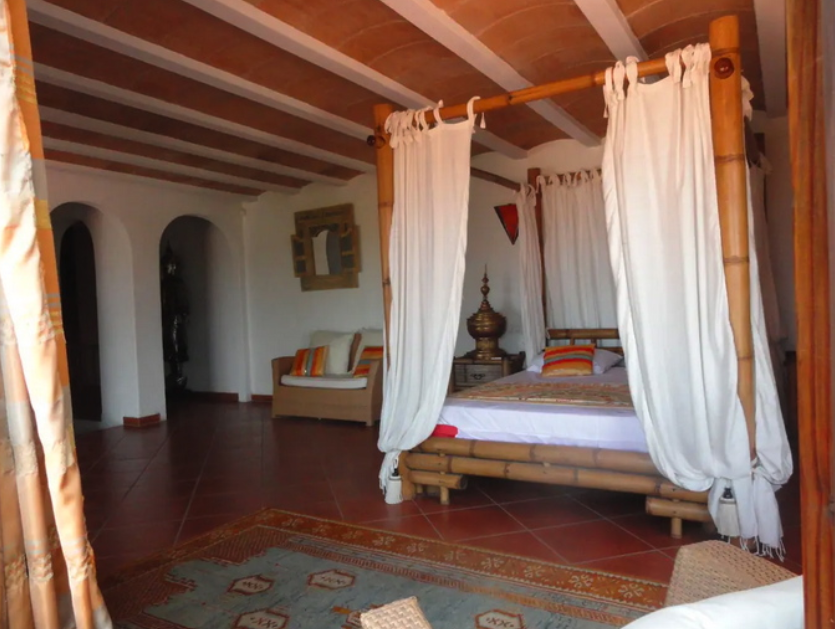 La casa principal cuenta con dos amplios dormitorios dobles en suite, cada uno con terraza privada y aire acondicionado, perfectos para disfrutar de momentos de relax con vistas espectaculares. El salón es un espacio amplio y luminoso equipado con TV vía satélite y aire acondicionado, ideal para reuniones familiares. La cocina está totalmente equipada para satisfacer todas tus necesidades culinarias.