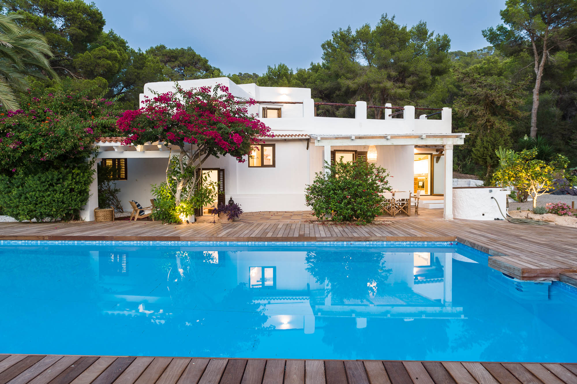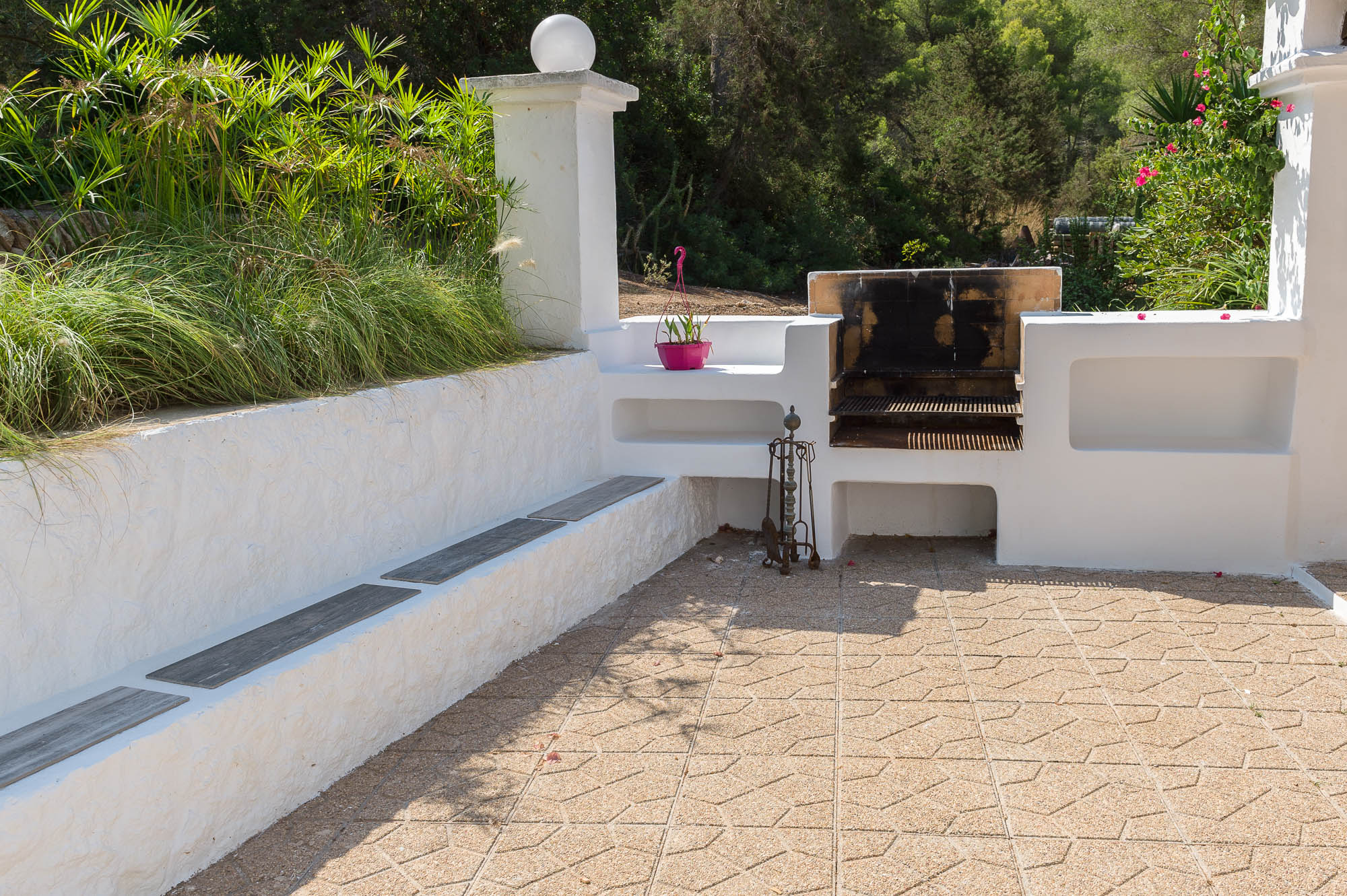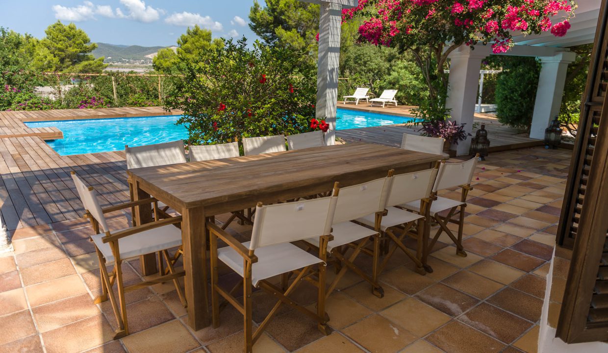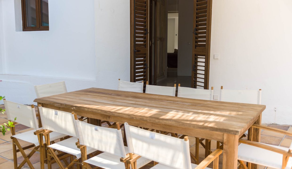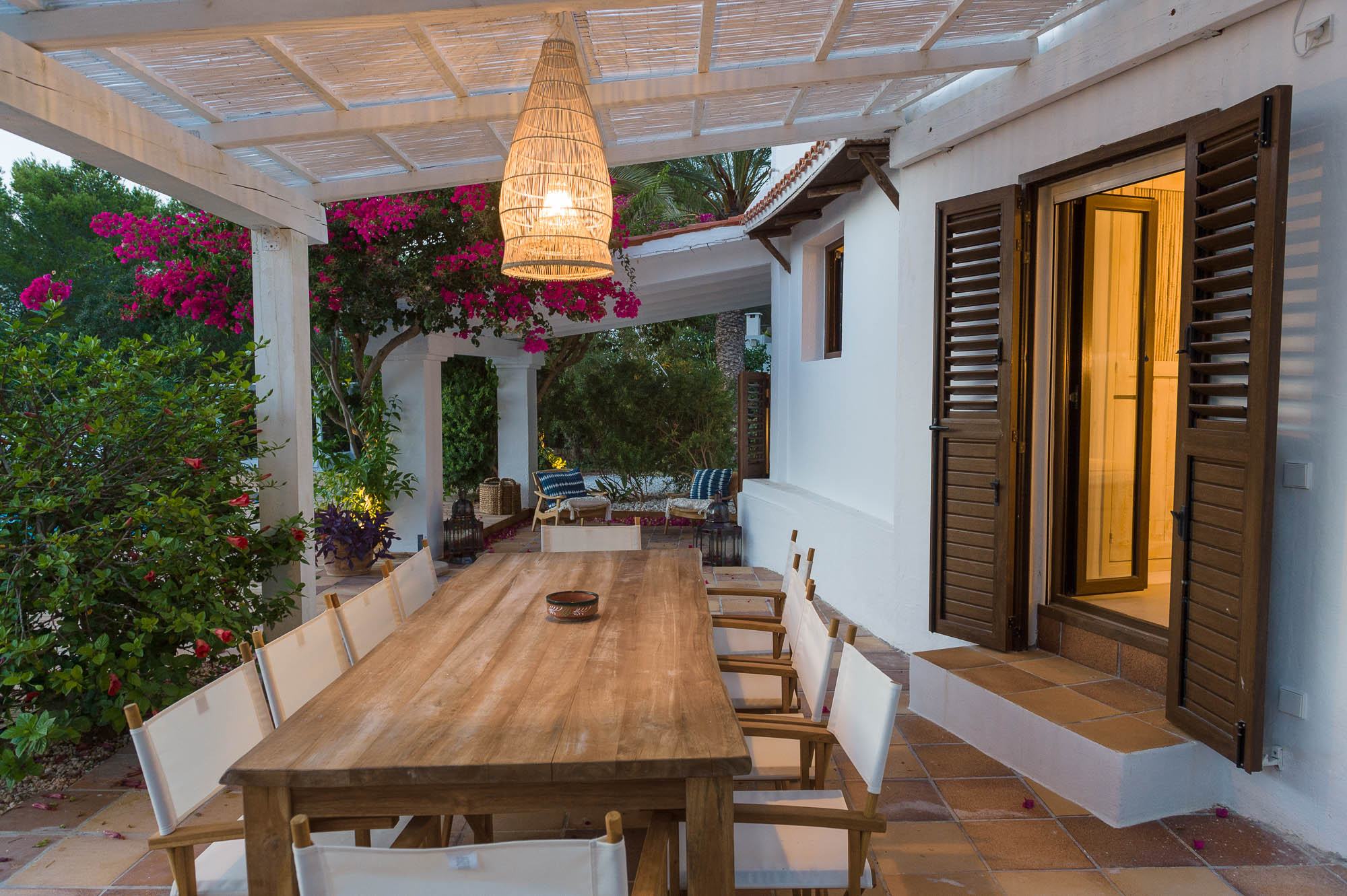 En el exterior, nos recibe un cuidado jardín mediterráneo que rodea una amplia piscina, y desde otra terraza se accede a un área de comedor al aire libre con una barbacoa.