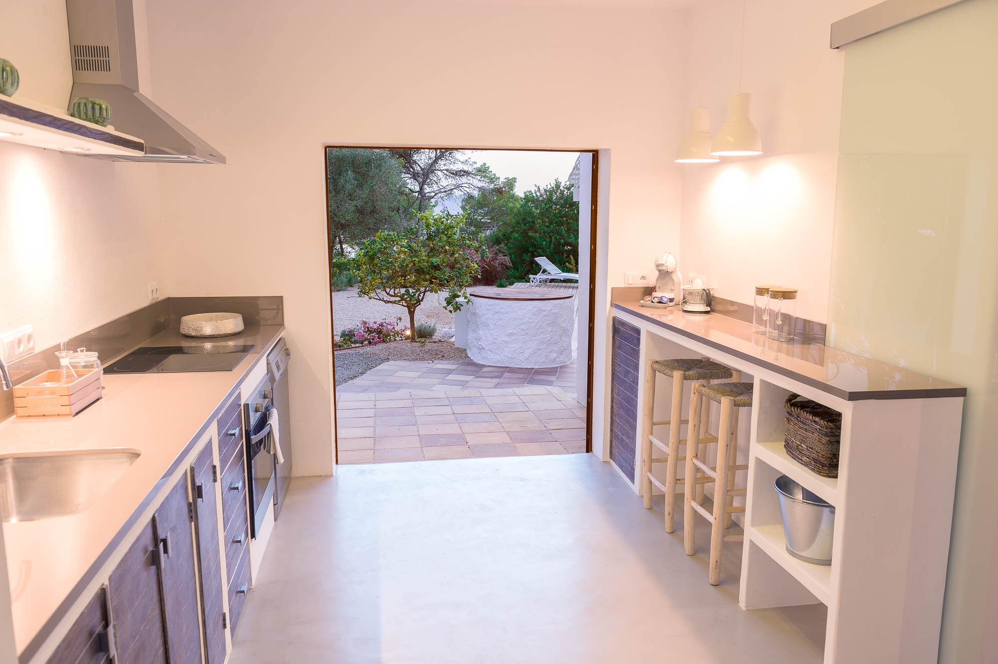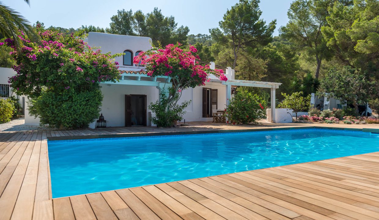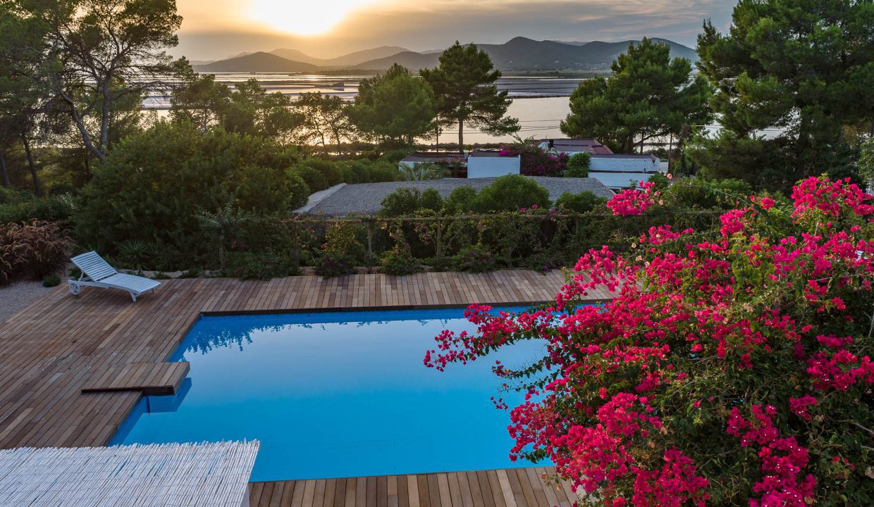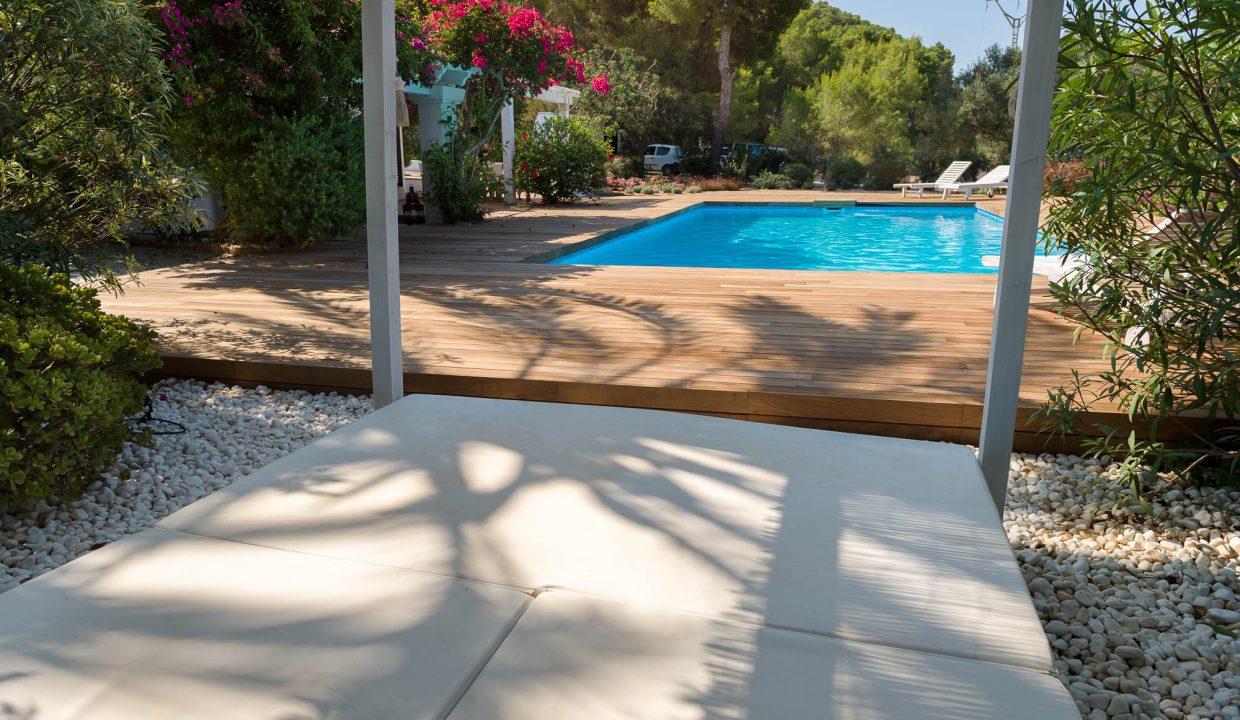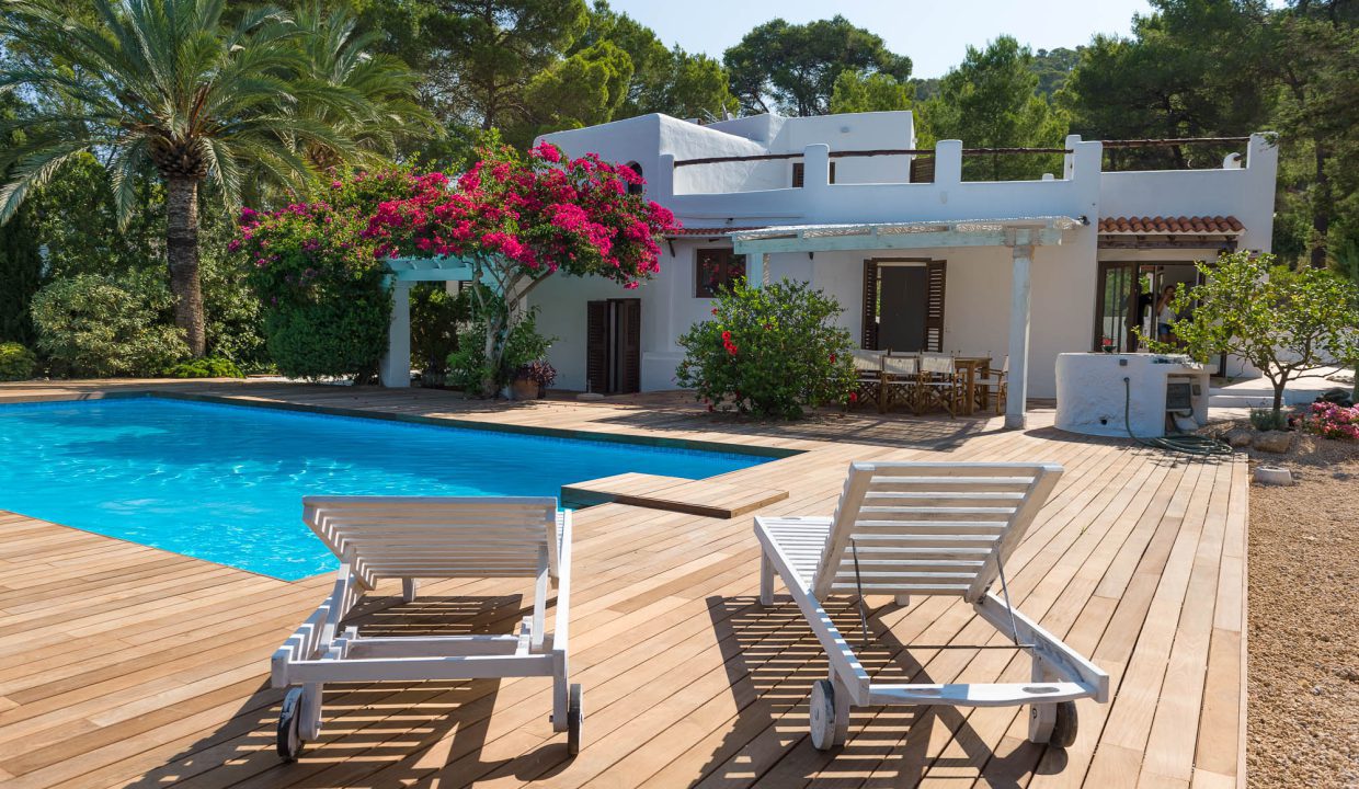 En el exterior, nos recibe un cuidado jardín mediterráneo que rodea una amplia piscina, y desde otra terraza se accede a un área de comedor al aire libre con una barbacoa.