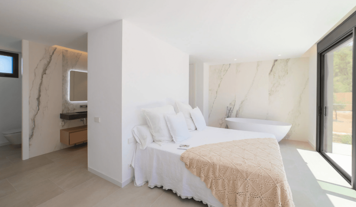 La casa está ubicada en la zona de Roca Llisa, junto al campo de golf de Ibiza y a solo 2 km de las playas. La construcción se ha completado recientemente, y el jardín paisajístico está casi terminado. La casa cuenta con una gran parcela de 1500 m² con zona de estacionamiento, piscina, exuberantes jardines y un espacio habitable de 378 metros cuadrados con un concepto de vida abierto. Ofrece impresionantes vistas al mar y al campo de golf.