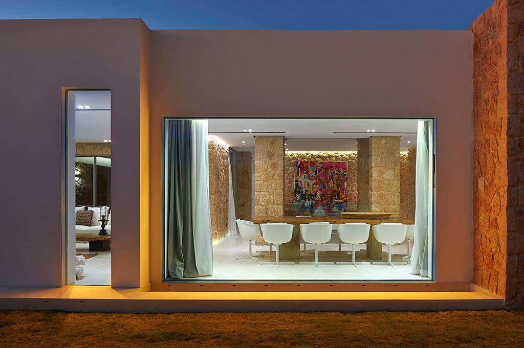 Interior Sala de estar con sofás y sillones de diseño y chimenea. Cocina equipada con microondas 90, nevera doble y lavavajillas Neff, pequeños electrodomésticos con cafetera americana Electrolux y máquina de café Nespresso; hay otra cocina de servicio, con acceso de estacionamiento exterior. Mesa interior al aire libre para 10/12 personas.
