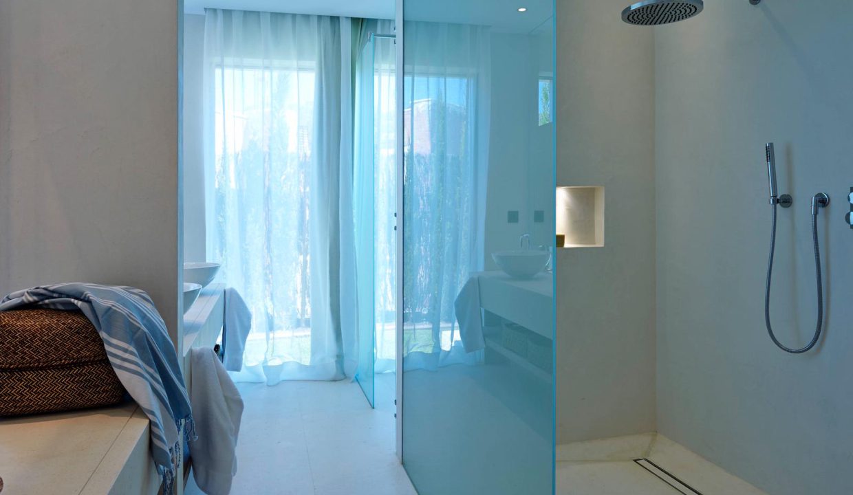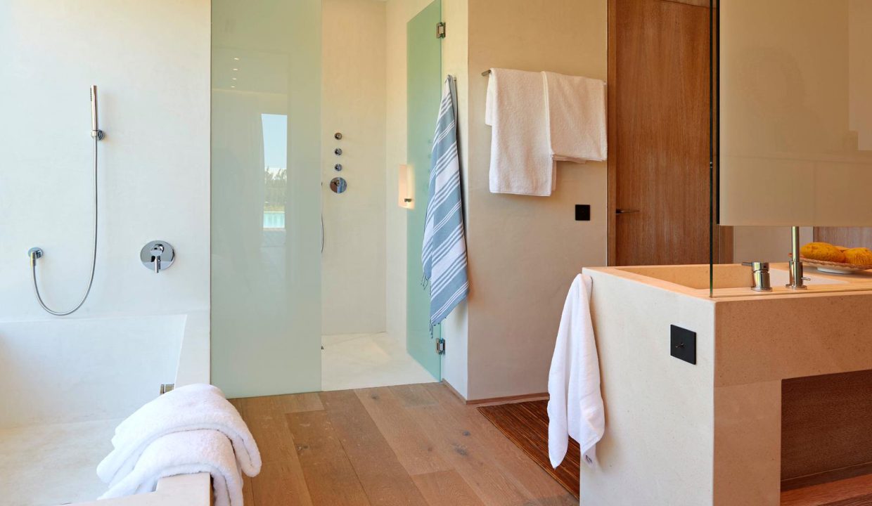Dormitorios y baños 4 lujosos dormitorios dobles con camas King Size para 8 personas en la planta baja, y un dormitorio para el personal, todos con acceso al espacio verde exterior de la villa. 5 lujosos baños en la planta baja con ducha, suite también con bañera. 1 habitación doble con baño con ducha en el sótano. Amplia lavandería con doble lavadora y doble secadora Bosch en el sótano.