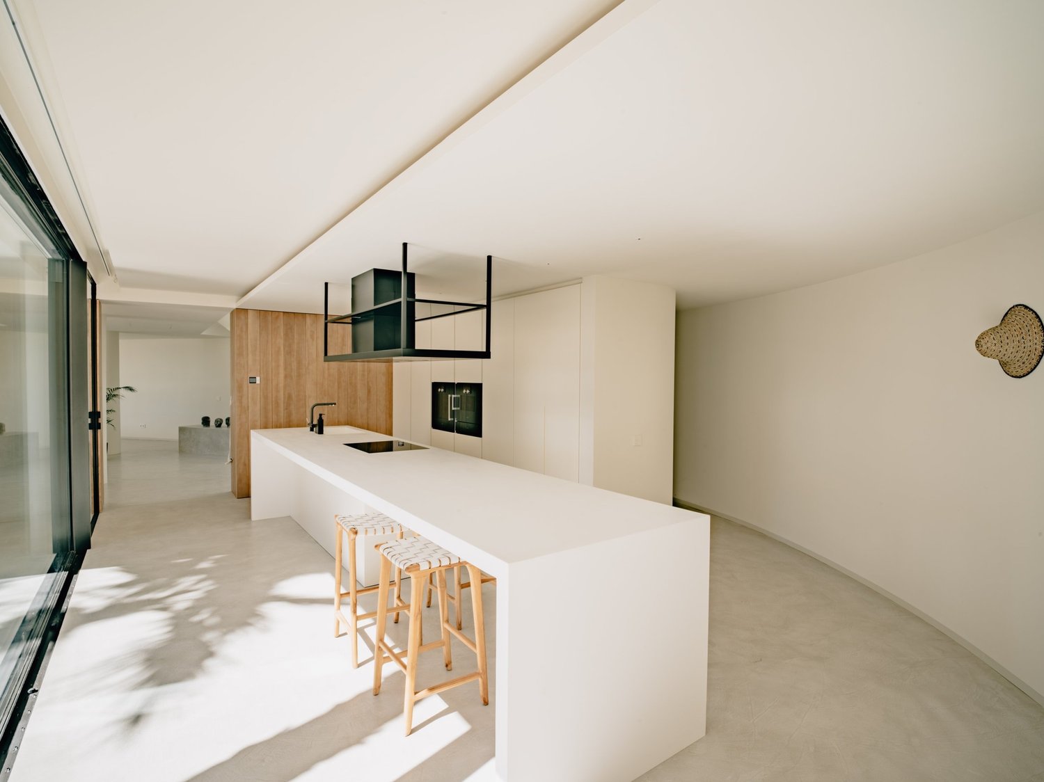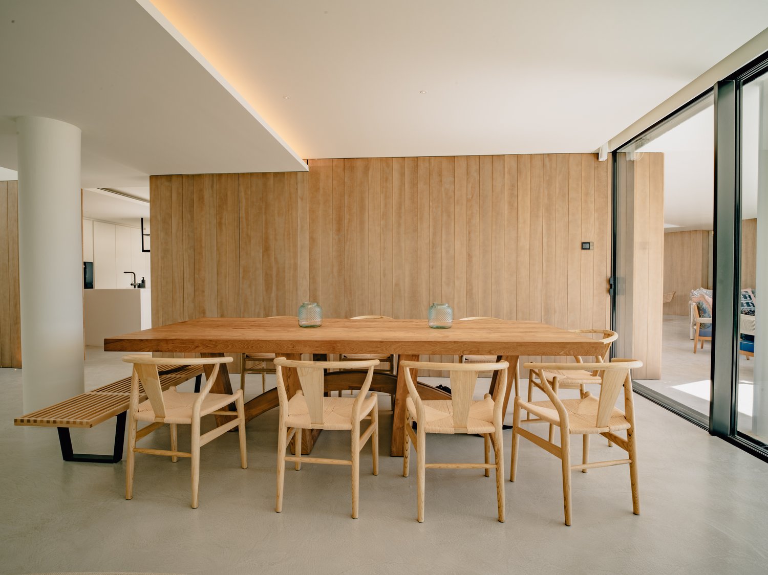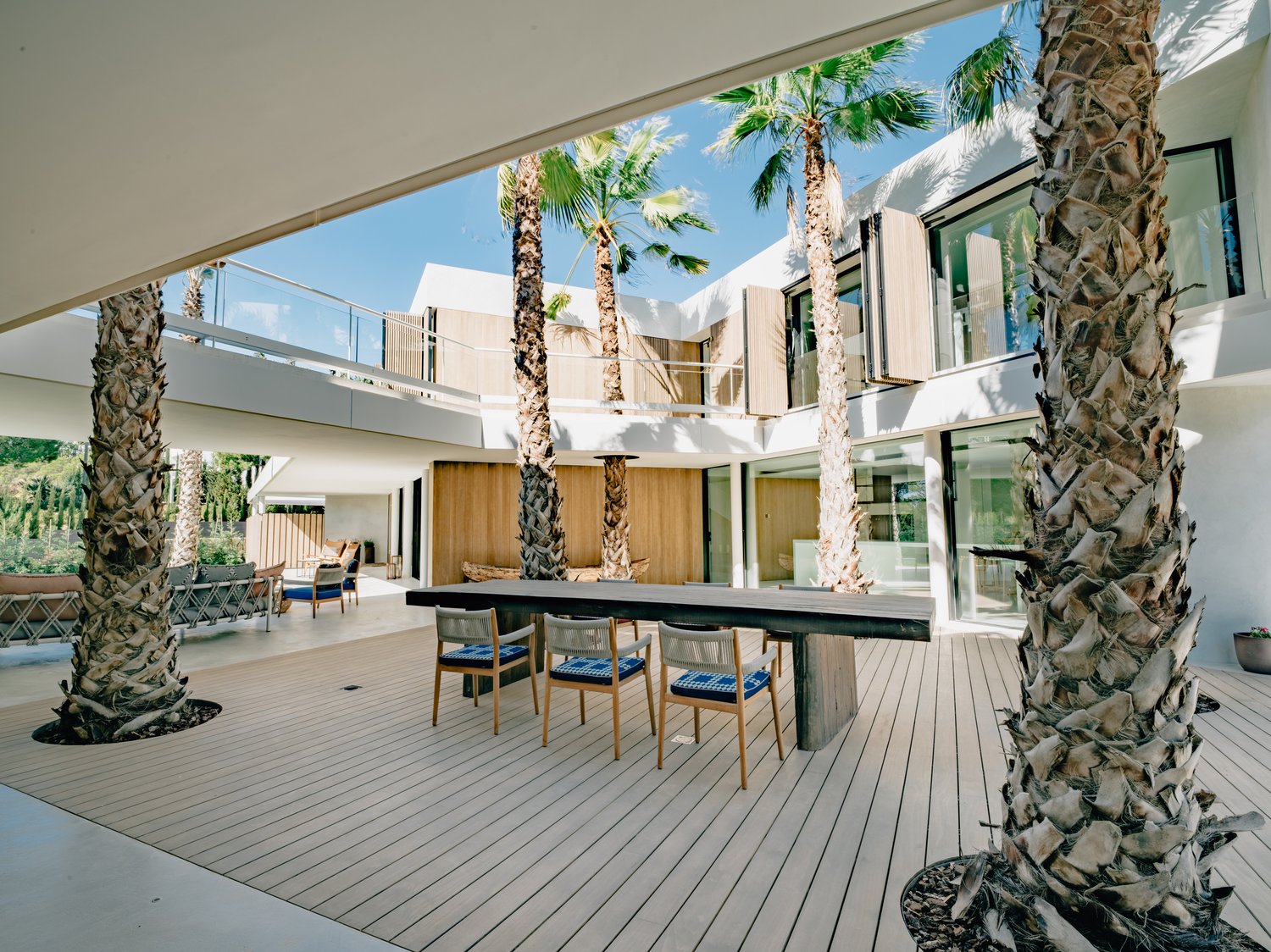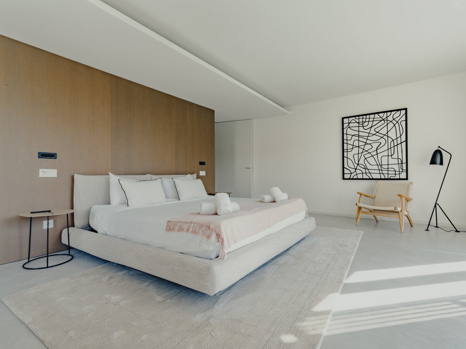 La casa principal consta del dormitorio principal y dos dormitorios de invitados en el nivel superior con hermosas vistas despejadas al mar y el diáfano salón-comedor en la planta baja, cocina de última generación y una espectacular terraza con cocina de verano. La casa de huéspedes incluye una suite principal con sala de estar y un apartamento independiente para el personal. Un hermoso jardín de césped rodea la piscina, mientras que un atractivo camino adoquinado conduce al garaje y al terreno inferior.
