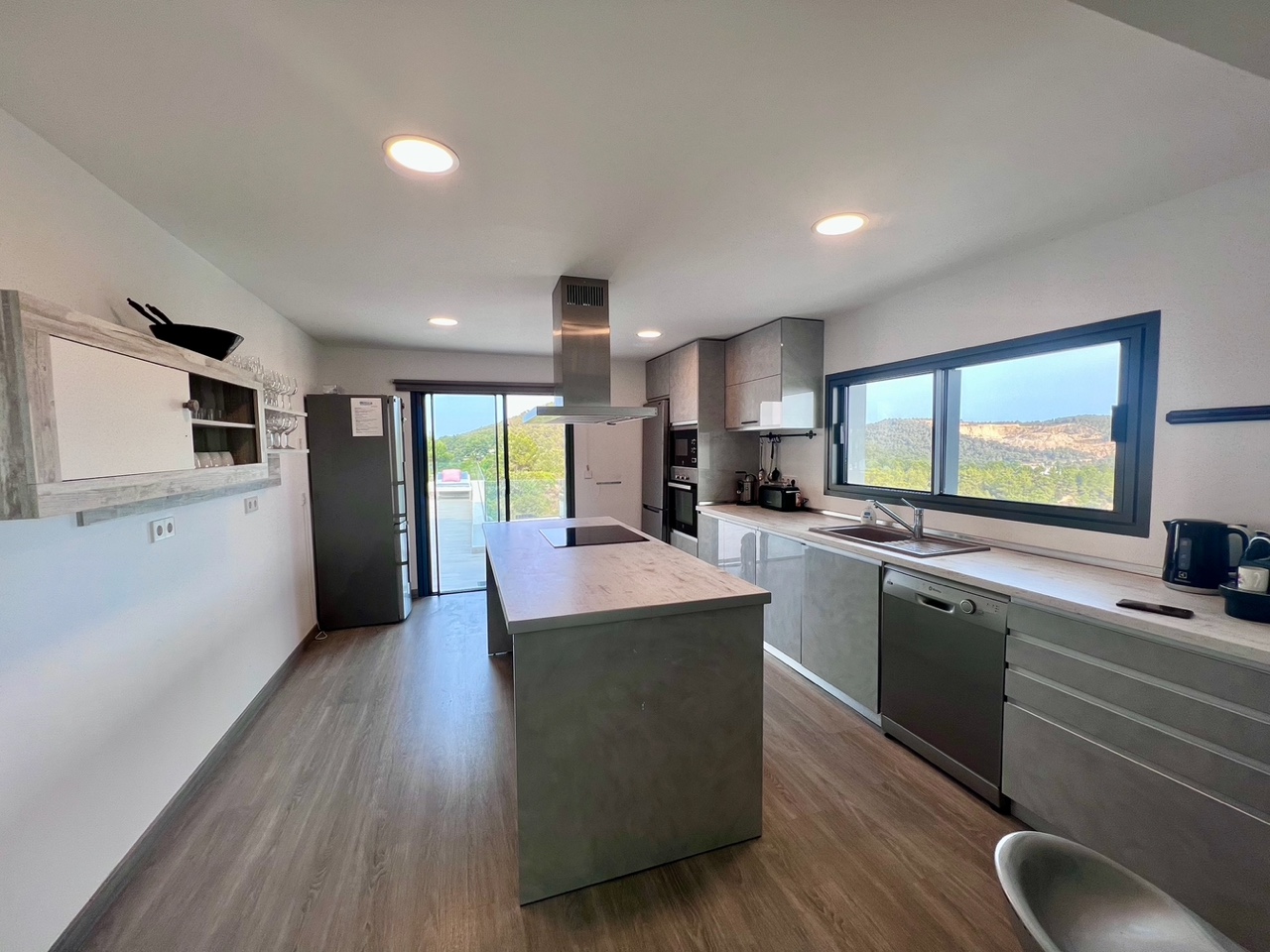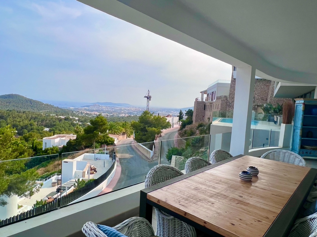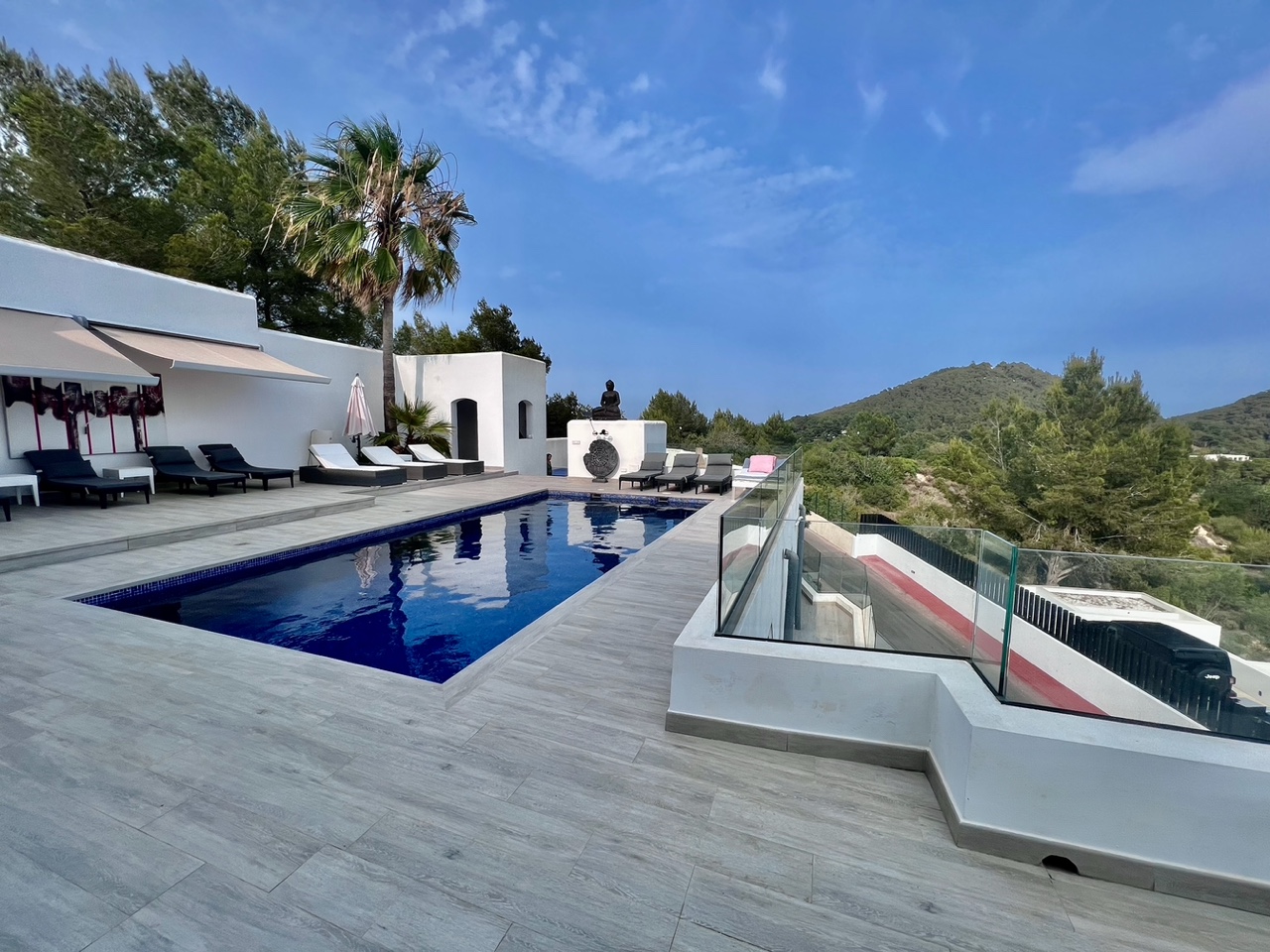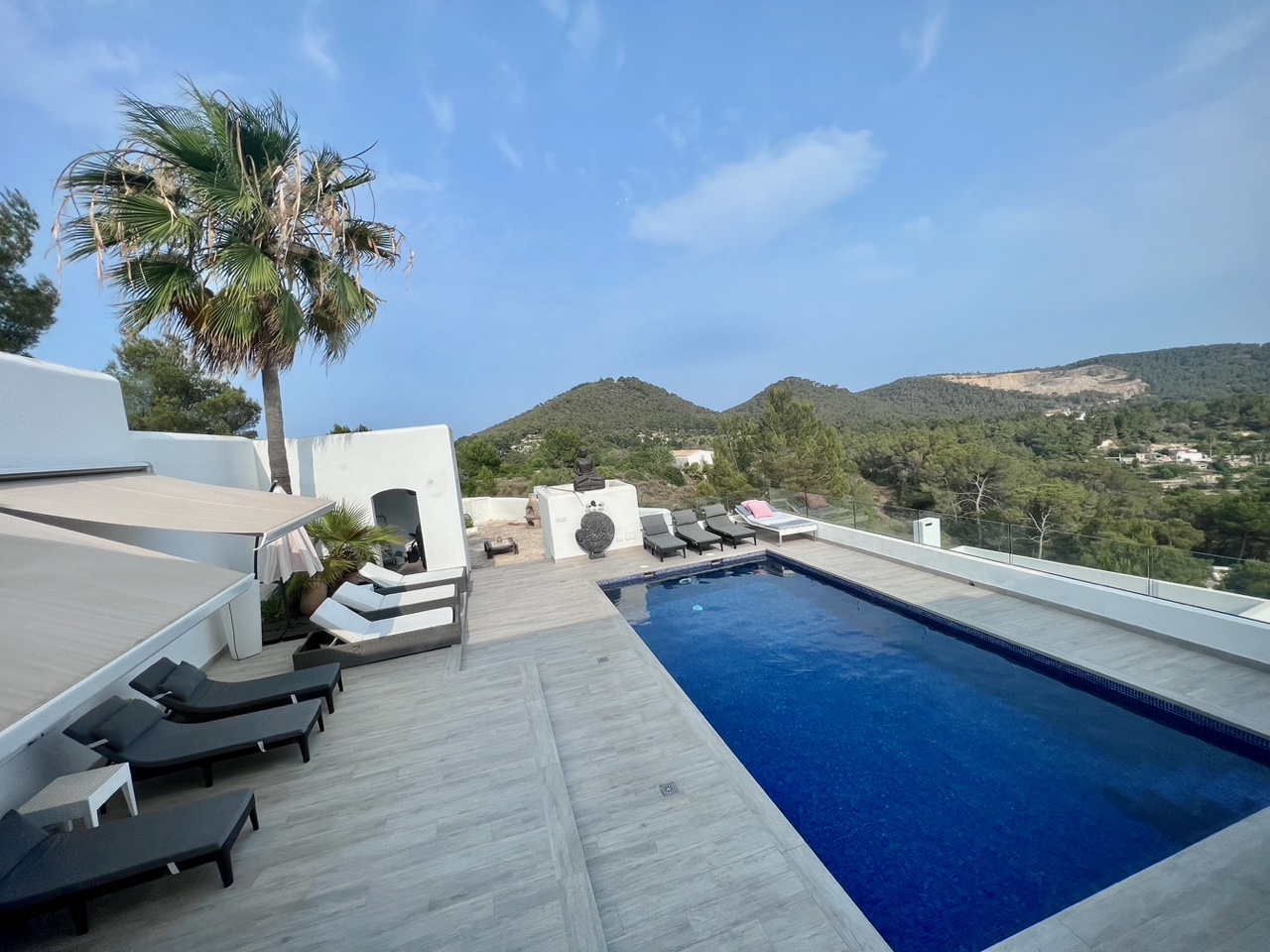 Esta hermosa villa se encuentra en una urbanización cerca de Ibiza con seguridad las 24 horas. La casa ha sido renovada este año en 2023 y cuenta con dos salas de estar, una en la entrada de la casa junto a un baño. Bajando unos escalones, encontramos el otro comedor con hermosas vistas al mar y acceso a la terraza delantera que conduce lateralmente a la piscina. Junto a la sala de estar hay una amplia cocina también con vistas al mar y acceso a la piscina a través de una puerta corredera.
