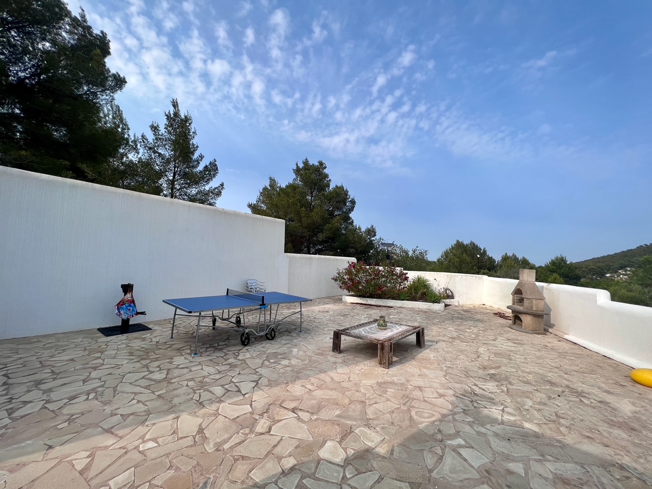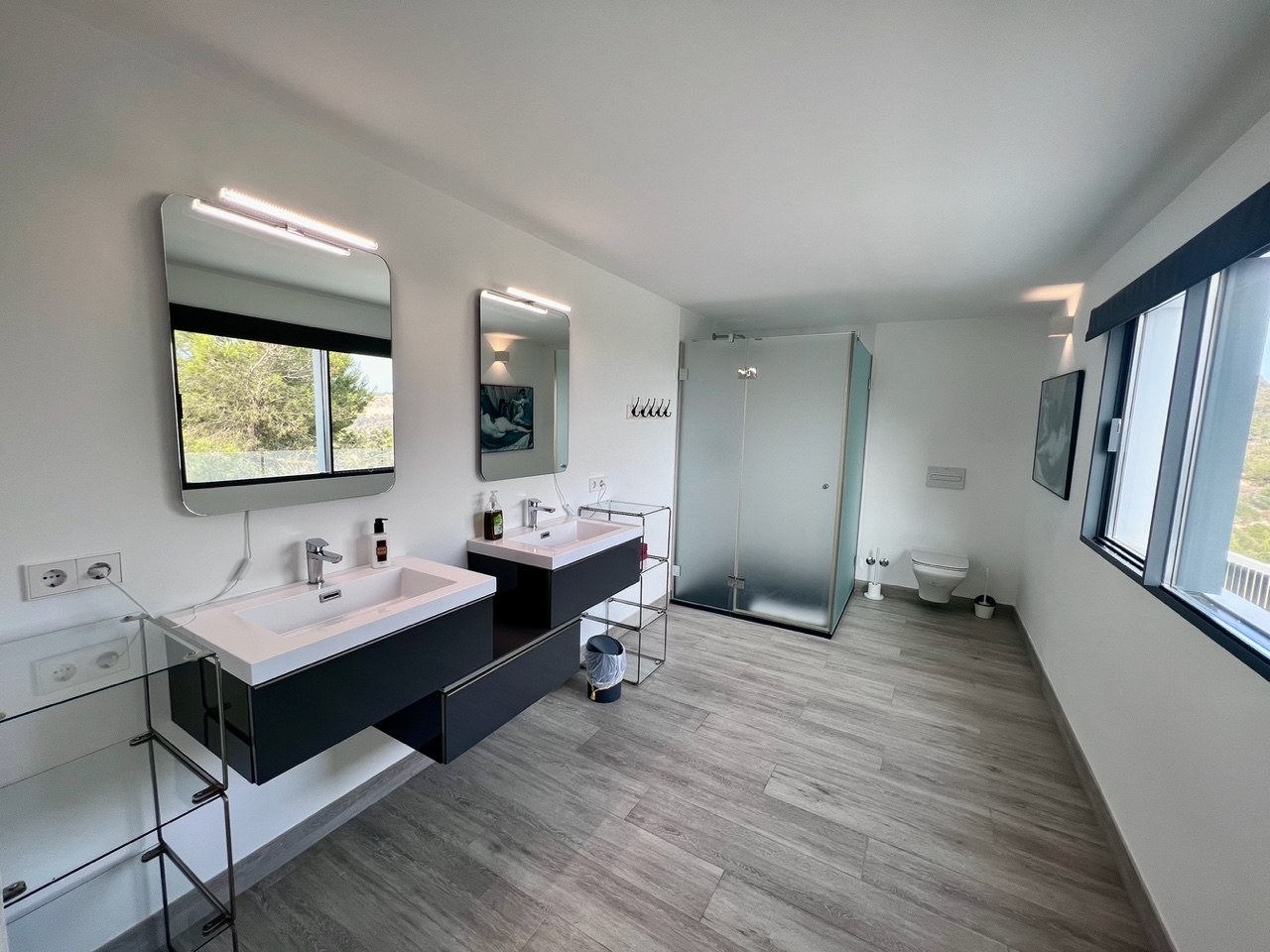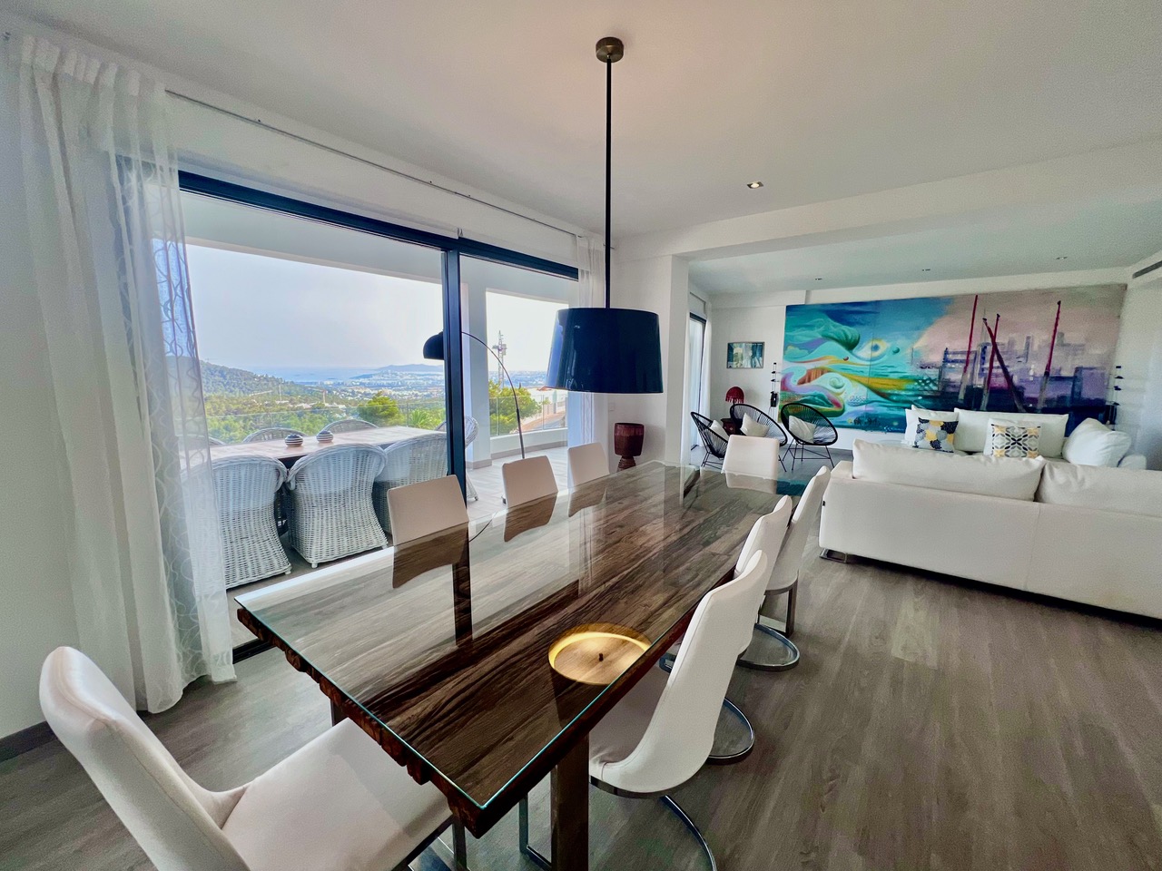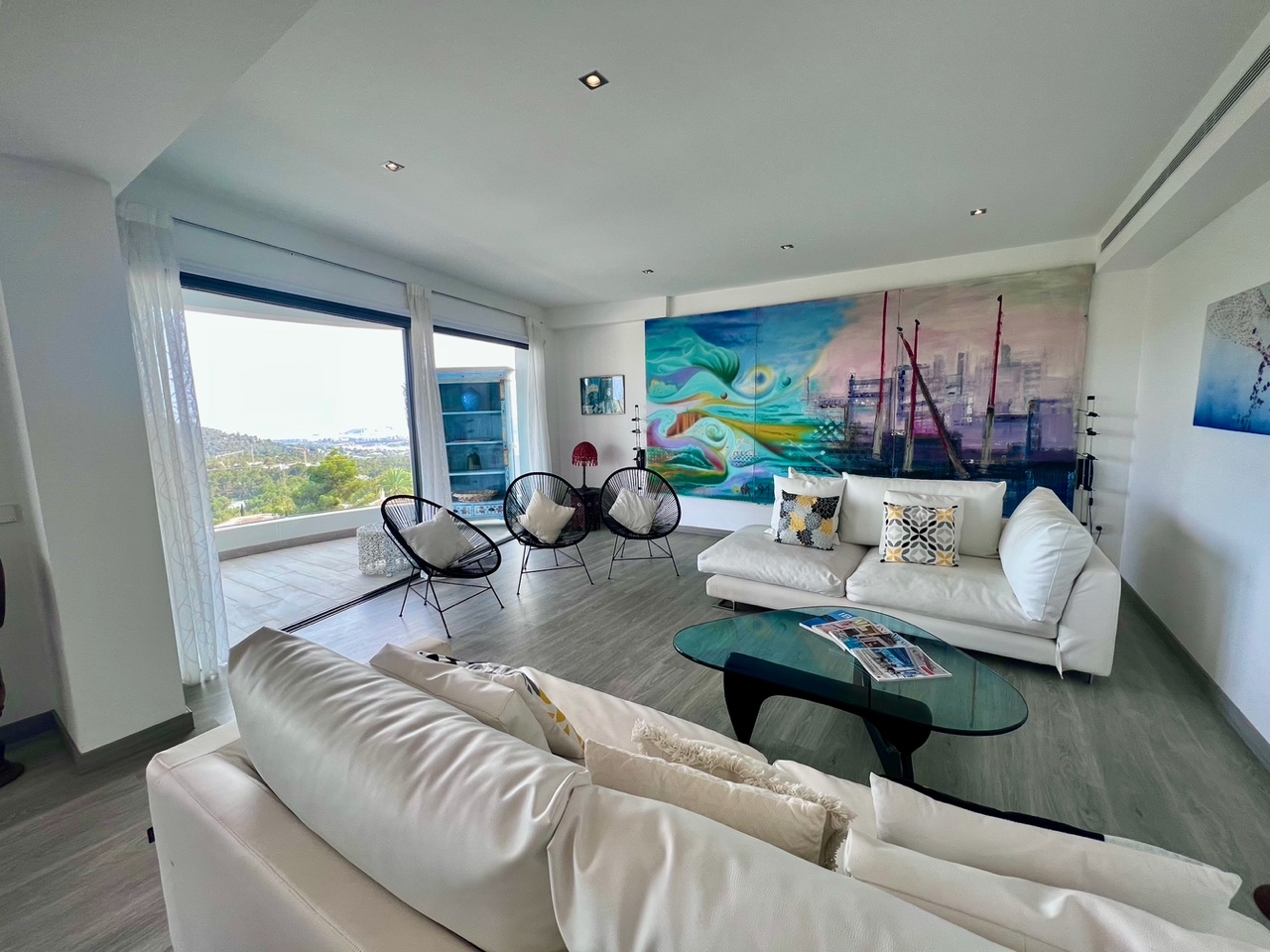 Esta hermosa villa se encuentra en una urbanización cerca de Ibiza con seguridad las 24 horas. La casa ha sido renovada este año en 2023 y cuenta con dos salas de estar, una en la entrada de la casa junto a un baño. Bajando unos escalones, encontramos el otro comedor con hermosas vistas al mar y acceso a la terraza delantera que conduce lateralmente a la piscina. Junto a la sala de estar hay una amplia cocina también con vistas al mar y acceso a la piscina a través de una puerta corredera.