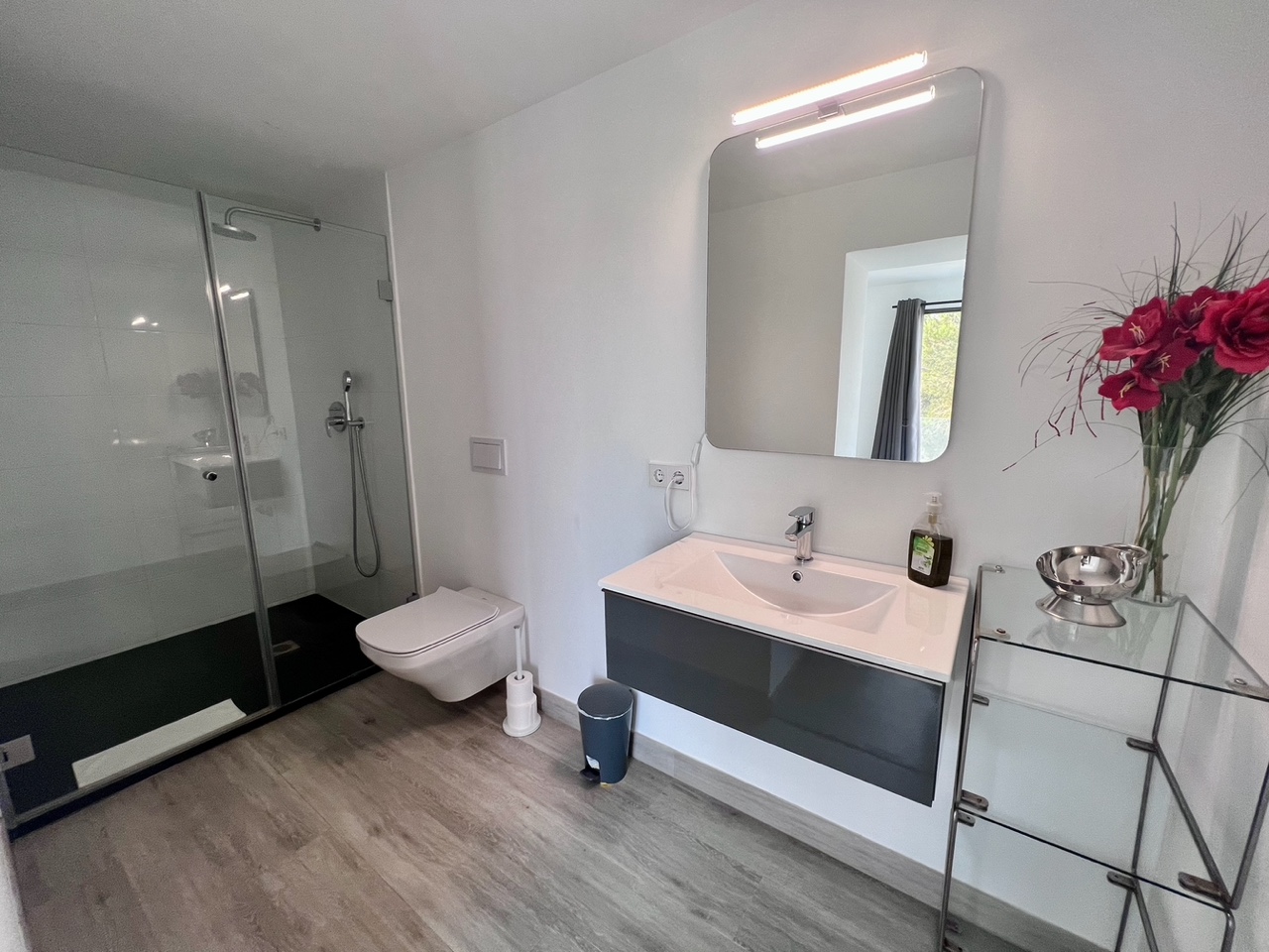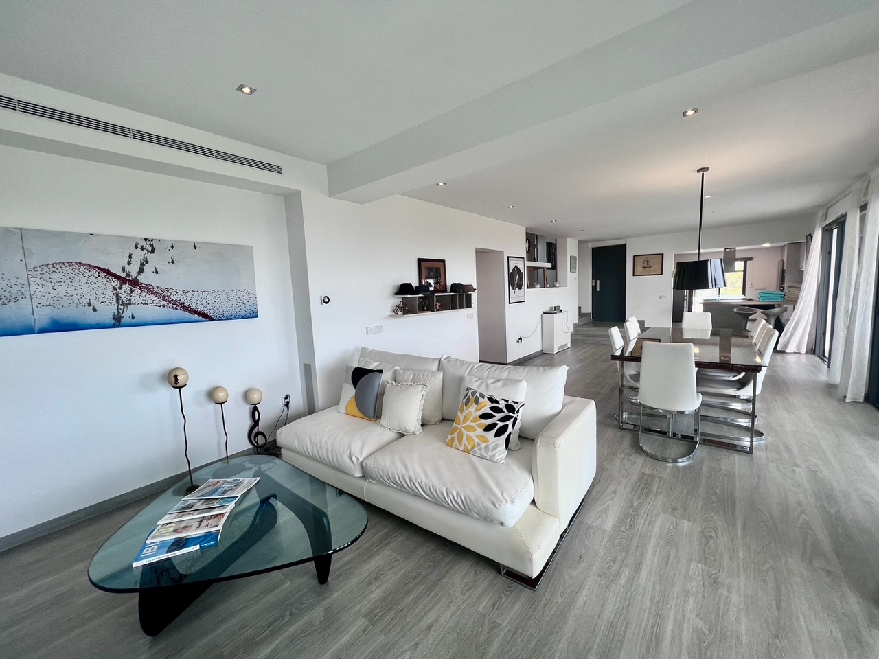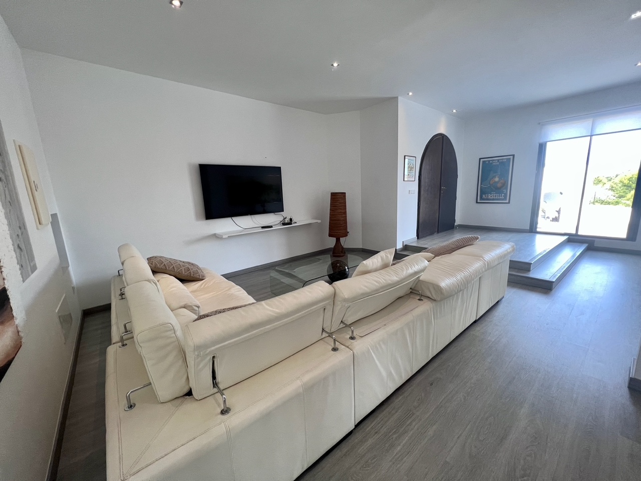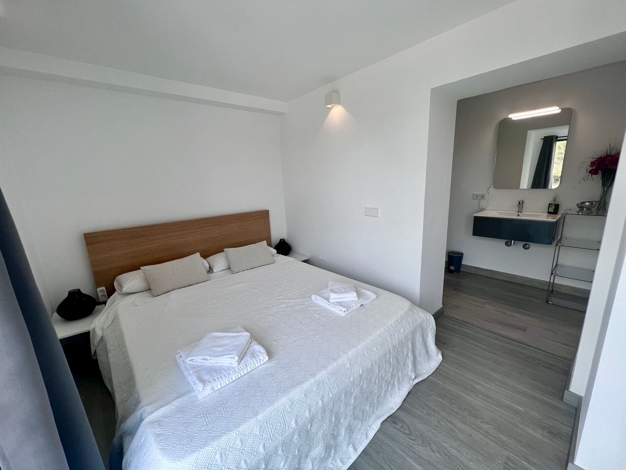 Esta hermosa villa se encuentra en una urbanización cerca de Ibiza con seguridad las 24 horas. La casa ha sido renovada este año en 2023 y cuenta con dos salas de estar, una en la entrada de la casa junto a un baño. Bajando unos escalones, encontramos el otro comedor con hermosas vistas al mar y acceso a la terraza delantera que conduce lateralmente a la piscina. Junto a la sala de estar hay una amplia cocina también con vistas al mar y acceso a la piscina a través de una puerta corredera.