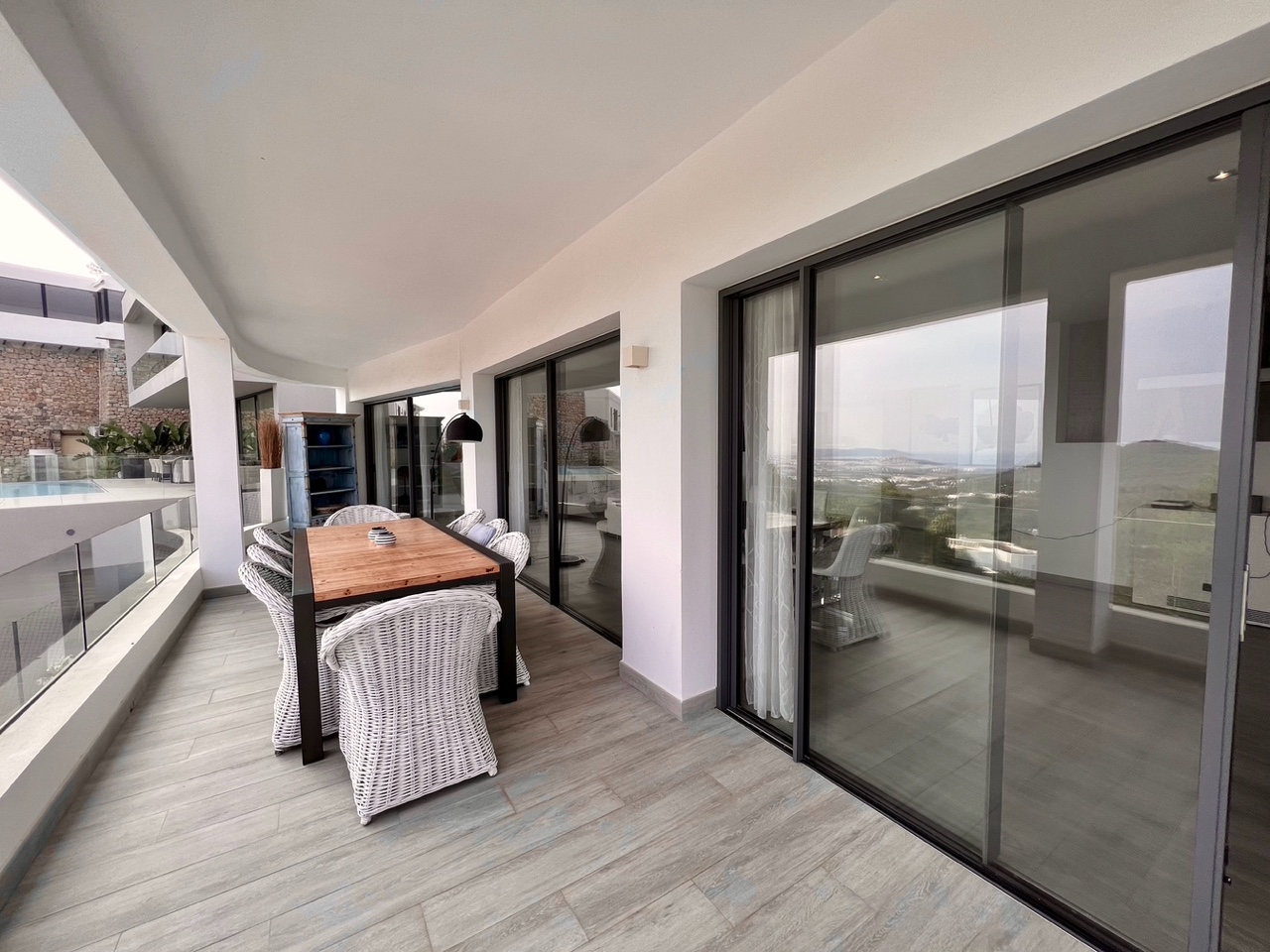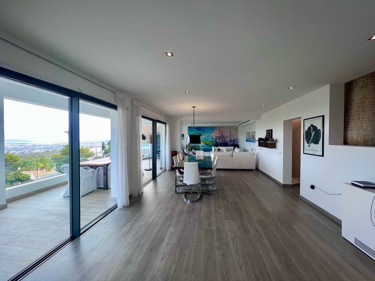 La piscina está ubicada en el lateral de la casa con una amplia zona de solárium y hermosas vistas desde su terraza acristalada. Hay acceso desde la piscina a otra gran terraza donde hay una barbacoa y una mesa de ping-pong.